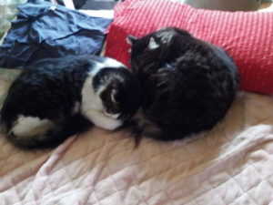 お風呂から出て来たら、びしょ濡れの男の子2匹が居ました。タオルドライしてカリカリを上げて…最近では2つの枕を盗られるので、私が昼寝の時は困るんですよね。でも、珍しく場所取りをしませんでした。