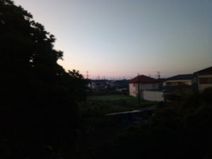 5時30分の空です。屋根が光っています。雨では無いような…。物干し竿の上側には細かい水滴…これは雨ではありません。冷気です。茨城県辺りは早霜?