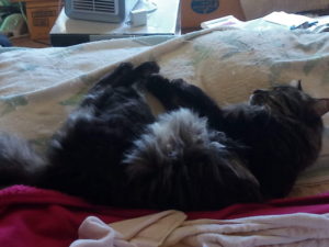 洗濯ものを物干しに干した後で、バターコーヒーの準備をしています。お風呂に入って居る時にトラ子の『ただいま~!』を聞いた気がしたのですが…あ、枕で寝ている!タイガーさんも昼寝です。物干しのレタスの4連トレーに小さな芽が出ている様な気がしましたが、乱暴な水遣りをしたため行方不明です…涙。