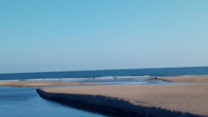 河口には親子ずれが川を渡って居ます。波は静かな海です。