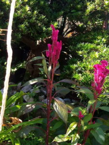 (左)ワインカラーの鶏頭の花。