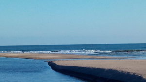 河口には親子ずれが川を渡って居ます。波は静かな海です。