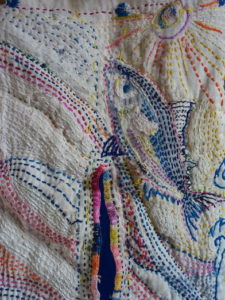 私は針仕事をし始めるとドテッと座り込み、動かなくなります。猫の出入り口の内側の暖簾をタオルを裏側から当てて刺し子しました。何とか完成です。何年前の手ぬぐいでしょうね。10年処じゃないですよ。暫く私が使って、2015年に刺し始めたものです。外側で紫外線に当たって、ボロボロになりながらもまだお役御免にして貰えません。愛着があるんですよね。冬用の少し重い暖簾です。