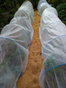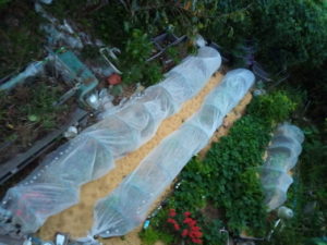 台風の進路如何により、まぁ、ダンポールを外してベタ掛けに重石で台風を乗り切る事は確実になりそうな雰囲気ですが、今日の午後から前線の雨が来そうです。少しの風なら持ち上がらない様に、後で米糠も籾殻の上に振って置きましょう。籾殻は虫がトンネル内に入る確率を低くしようと載せてあります。