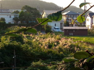 明るくなりかけた空の下、百舌鳥が鳴いています。
