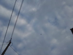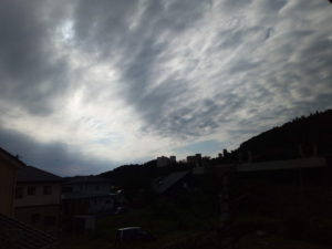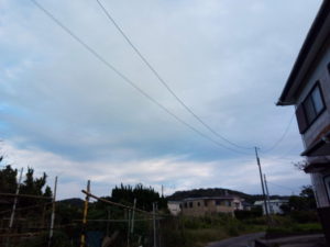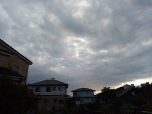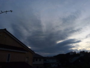 (右)東―東南東の雲も気になるなぁ。写真では分かりにくいですが、釈に見えました。八丈島東方沖や台風がばらけた、と言う雲さんの言葉が引っ掛かるなぁ。
