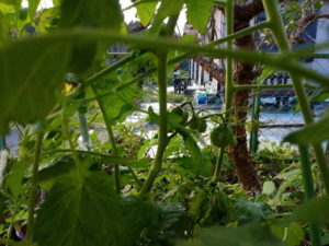 (右)溢れていた堆肥枠は雨後に随分嵩が減りました。また、草を入れないといけないですね。