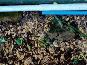 (右)溢れていた堆肥枠は雨後に随分嵩が減りました。また、草を入れないといけないですね。