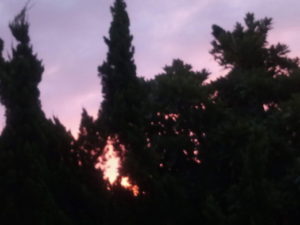 (中)カイヅカイブキの向うに太陽が上って来ます。