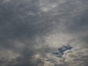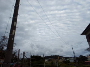 16時18分、買い物に行く前の西南西の釈(左&中)、東の釈(右)。低層に黒い雨雲がフワフワしていて、中層以上に波状雲が空一杯に広がっています。