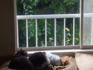 キーキーいう音がまたしました。うめにしては大きい!タイガーさんだ。家でお昼寝だそうです。福が寝ているので、福から見えない所を選んで寝ています。ガラス戸をキーキーやると良い、と言うのはうめはタイガーさんから教わったのね(笑)。
