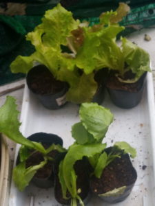 (右)レタスが定植を待っています。手前が結球レタスのシスコです。一階から物干しへ移動しました。やはり、紫外線を当てないと、植物は弱って仕舞いますからね。