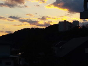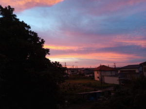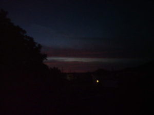 5時17分、未だ暗いのに茜色が見える!いつもなら5時30分過ぎた頃の景色です。これは来る、朝焼けが来るぞ!