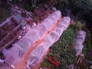明日は玉葱の使わないものを畝に植えましょう。中央通路の両側は韮のグリーンベルトを作りましょう。一所懸命、種を蒔いていますが、先日蒔いた物は発芽したのかなぁ。そうは見えなかったけれど。ラディッシュが発芽していましたね。古い乙女2号の種が発芽していないので、グリンピースやスナップエンドウを蒔きましょう。明日は水遣りと遅れている施肥とマルチングを致します。茄子も収穫して木を切ります。
