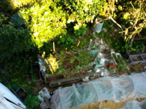発酵温床が蔦類、柿の木の枝、サツマイモの葉蔓、生姜の茎葉で、再び一杯になりました。ジャガイモのプランターに発酵温床で出来た土を入れました。