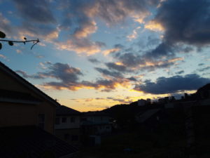 来ました!5時47分、超絶な朝焼け!これは半年に一度あるか無いかのレベルです。東北東と東に雲が出ています。