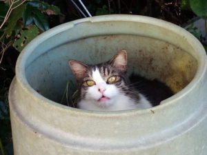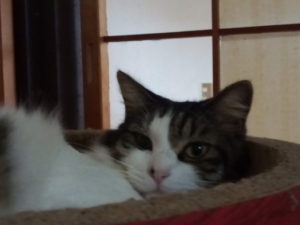 14時、トラ子が帰って来てカリカリとちゅ~るを食べ終わると、うめが帰って来てちゅ~るを食べました。外へ向かって呼んだら、福も帰って来てちゅ~るとジュレを食べました。