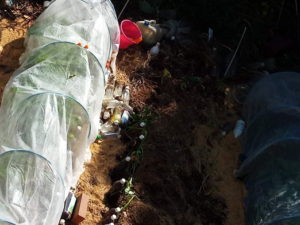 (中)中央通路の水のボトルを引き抜いては韮の種を落としました。