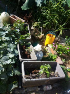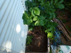 (右)庭への出入り口にあるプランターには既に先週ヒョロヒョロと伸びた茎を倒して堆肥を置いて見ました。ジャガイモは元気の様に見えます。