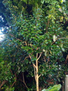 (左)中心部の込み合った所を一部間引き剪定した椿。未だ上に薮枯らしが覆いかぶさっています。