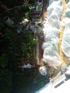 (左)脇の通路から菜園に出た処の三本の土留めプランターに植えられているのはジャガイモです。梅の樹横の堆肥枠に出来た土をジャガイモの茎を横に這わせた上から掛けました。