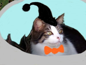 オレンジの蝶ネクタイと黒い帽子を被って貰いました。(;^_^A 時間掛かったけれど、面白かったです。こんな単純なのに、筋肉の動かし方とか気にしなきゃならないし、成程ね。難しいんだね。私がお絵かきに夢中になっている間、福が寂しそうにしていたので、ベッドで寝なさい、と抱っこしたら、ゴ~ロゴロ…でした(笑)。