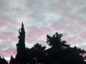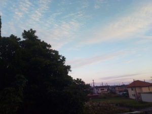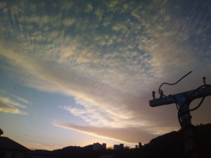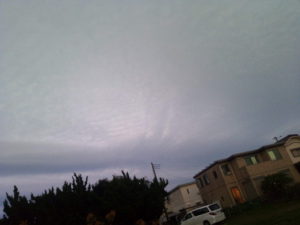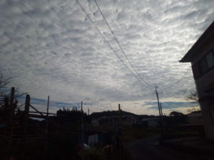 (中)カイヅカイブキの上に扇状に広がる鱗雲…波状雲に近いですかね。