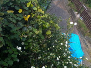 3時間程庭仕事をして来ました。堆肥枠の中の剪定枝を小さく切って入れ直し、次の槿を選定し、2年振り位で椿の間引き剪定もしました。アマゾンからワイアが来ないので(😻支払い未だでしょ!?)、私の大嫌いな5枚葉の蔦蔓で紐の一段下の段を縛って置きました。結構丈夫である程度使えそうです。一寸見直しましたねぇ。
