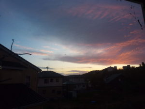 5時44分。鱗雲が扇状に広がったのを撮れる明るさになりました。