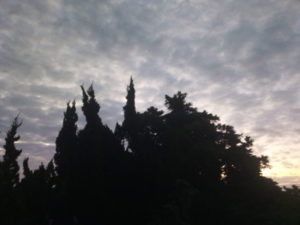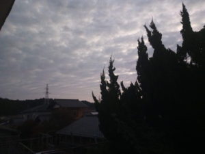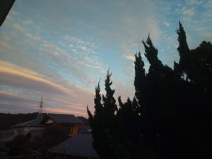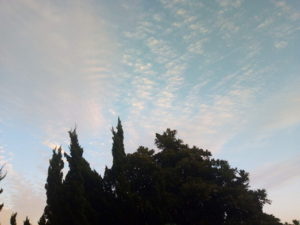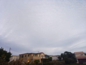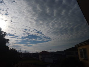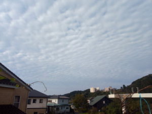 (中)カイヅカイブキの上に扇状に広がる鱗雲…波状雲に近いですかね。
