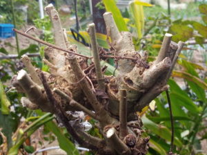 あれから2時間、食事もせずに集中して枝落としをしました。3本位の主枝のコブの処まできり落としていました。最初は剪定鋏を使っていましたが、どうも鋏だと、丸コブにならず、今年の様子を見ていると水は溜まらないにしても足場が虫の為にとても良く出来て、産卵/育幼虫がとてもうまく行ったのでは、と思えました。