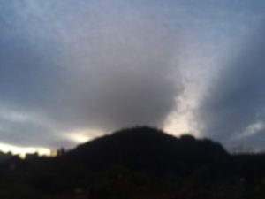 (中)美化ステーションの方角に歩いています。左の強い雲から小さな釈が真東でしょうね、出ています。