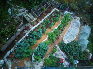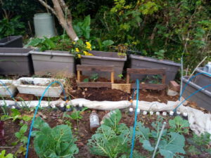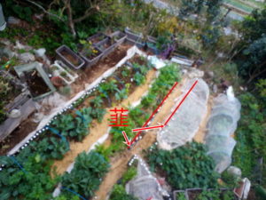 (右)今年は一所懸命に町中の、何方にも所属していない韮の種を集めました。お陰様で沢山集まりましたので、中央通路のボーダーは韮で出来そうです。3畝と4畝の間も韮の様な低い野菜でボーダーをハッキリさせる事が出来たら良いですね。