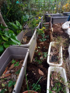 物干しにある野菜のトレーも畝に移植しましょう。万能葱は多分物干しが良いのでしょうね。分けつ葱は長さが20㎝以上になれば、ジャガイモプランターに入ります。