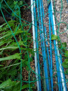この場所は夏に向かってだけ、草を放り込む堆肥枠が必要なんですね。だから、ビニール製の丸型堆肥枠を支柱で固定して春―秋に使おう、と考えています。