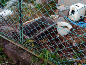 (中)苺の地植えをします。うめのトイレとの間に極低いボーダーフェンスを置き、うめの前足で『一寸そちらの土を貰おうかしら。』、と言うのを防ぎます。