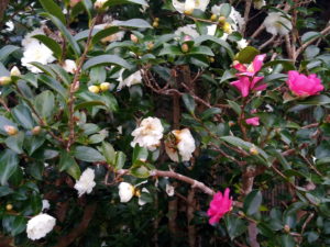 玄関前のお気に入りの菊。濃いピンクの覆輪とピンクの小菊。
