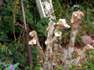 (左)一杯になった堆肥枠の枝を細かく切りました。古い方の発酵温床も同じ事をします。入れた剪定枝が長いと分解までの時間が掛かってしまいます。私は剪定枝や草を分解して堆肥を貰いたいのですが、その前に一番上の処で人参や南瓜を育てたいので、速く分解して良い土になって欲しいのです。