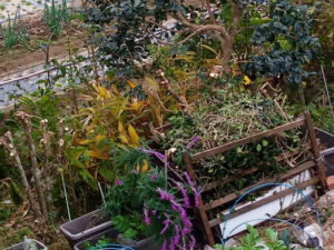 (左)一杯になった堆肥枠の枝を細かく切りました。古い方の発酵温床も同じ事をします。入れた剪定枝が長いと分解までの時間が掛かってしまいます。私は剪定枝や草を分解して堆肥を貰いたいのですが、その前に一番上の処で人参や南瓜を育てたいので、速く分解して良い土になって欲しいのです。