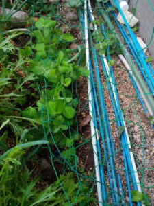 (中&右)アカバナ絹さやです。既にネットも張りました。今年はこの場所で絹さや―ゴーヤも育てるつもりです。
