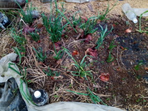 物干しにある野菜のトレーも畝に移植しましょう。万能葱は多分物干しが良いのでしょうね。分けつ葱は長さが20㎝以上になれば、ジャガイモプランターに入ります。