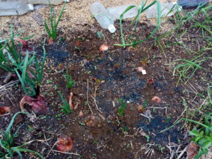 玉葱は真っ直ぐに立ち上がりましたね。きっと葉先を切って体重が軽くなったせいでしょう。寝かせ気味で植えたのに不織布を持ち上げて、起きて来ました。