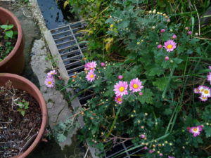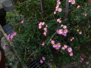 玄関前のお気に入りの菊。濃いピンクの覆輪とピンクの小菊。