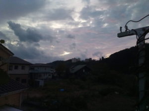本日の夕焼け・残照は雲が多い為、ありませんでした。真っ暗になってから岡の上の高校のシルエットが暗赤色の背景に浮かび上がっていました。