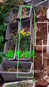 (中)苺の地植えをします。うめのトイレとの間に極低いボーダーフェンスを置き、うめの前足で『一寸そちらの土を貰おうかしら。』、と言うのを防ぎます。