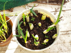 (左)物干しの葱の根元が段々緑になって来ました。手狭になって来たので、もう一つ鉢を増やしました。