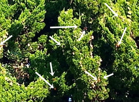 Tさんに回覧板を届ける途中、カイヅカイブキの日の当たる面にカラスウリの赤い実が沢山着いていました。『オカアシャン!』とトラ子が来ましたが、私の後を福が付いて歩いているのを見て、『後でね!』、と帰って仕舞いました。