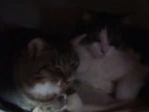 6時過ぎにトラ子が出掛けて、うめが帰って来ました。珍しく炬燵に入りたい、と言って入って来ました。その後で、福も入って行きました。『炬燵は好いもんだね。仲良くしているよ~』