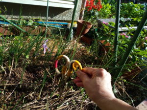 (左)この鋏でチョキチョキします。(中&右)5畝には結構アブラナ科が多いですね。何の零れ種?()