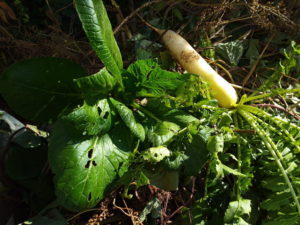 (中)今日の御惣菜は馬鹿デカイ小松菜がシスコを日陰にしていましたので、チョキンと収穫しました。大根も一本収穫。
